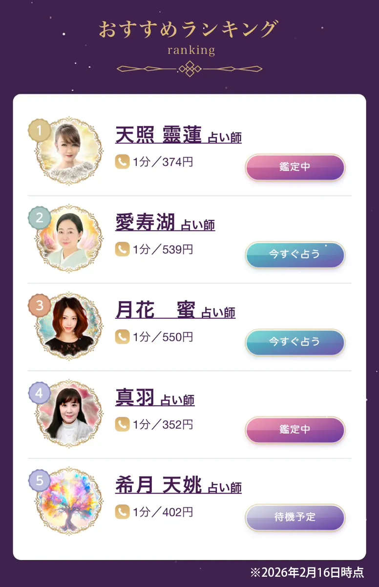 在籍している占い師の数×質がサイト全体の価値を決めます。鑑定歴が長く、得意分野が明確な占い師が多いサイトは信頼度が高いです。プロフィールや口コミをチェックして、自分の悩み(不倫・復縁・仕事など)に強い占い師を選ぶことが成功への近道です。